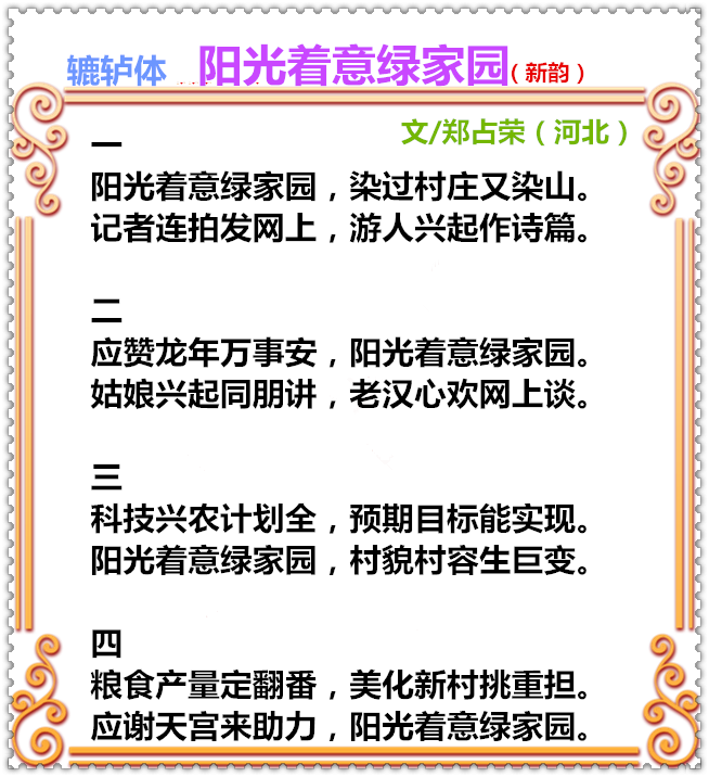 《阳光着意绿家园》作者: 郑占荣【大众原创诗词曲网刊】签约作家